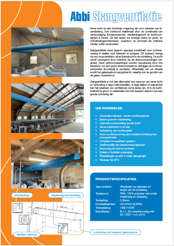 Door middel van overdruk in de buis wordt door de kleine gaten frisse lucht naar uw koeien of kalveren geblazen. Op deze manier wordt ieder gaatje van uw stal gevuld met verse lucht. Het gatenpatroon van de buisventilatie wordt berekend aan de hand van uw situatie om een maximaal effect te kunnen bereiken. De slangen zijn te verkrijgen met enkele of dubbele opening